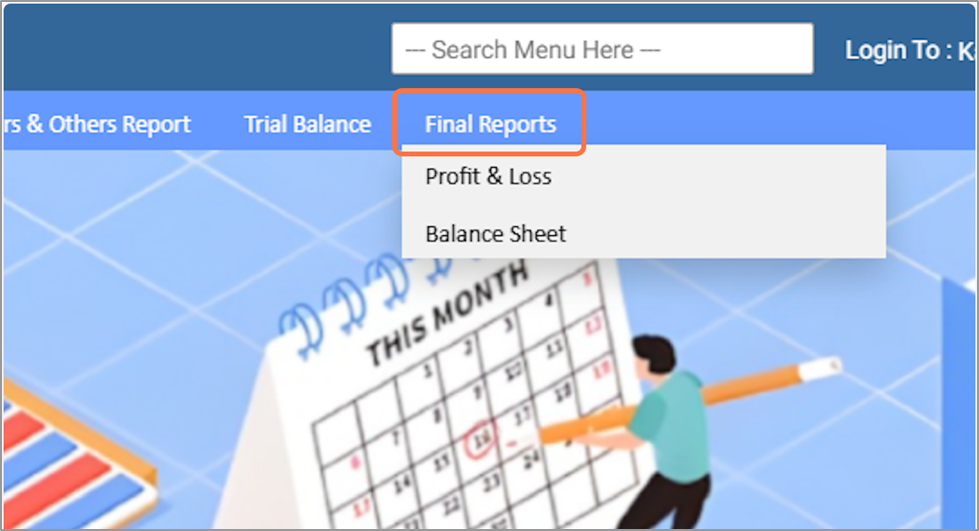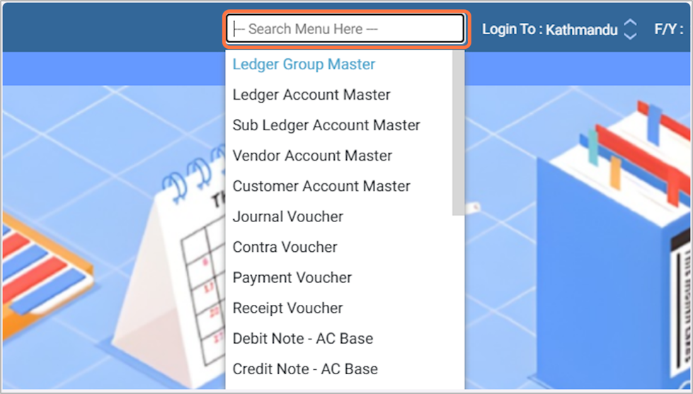If you click on “Search Menu Here”, you can search for any accounting feature or option available in the Account Module. A suggested list will appear as you type, and you can select the desired option directly from the list.¶