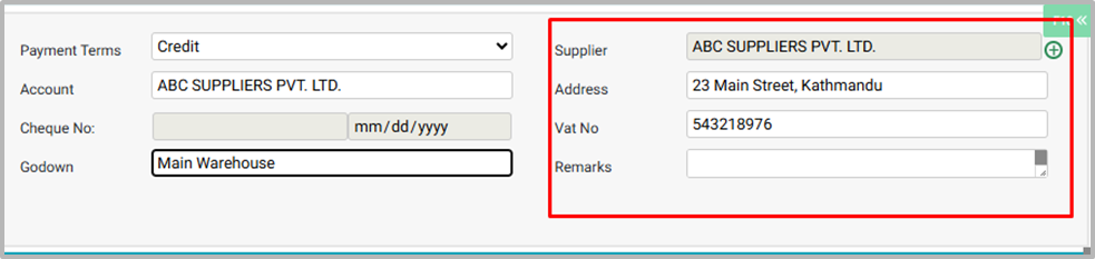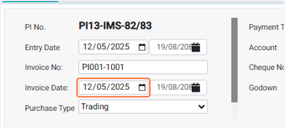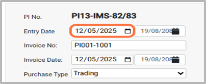 ● The Purchase Entry Date is the date of the purchase invoice entry, which can be edited as needed; backdating is allowed but future dates are not. Eg: 12-05-2025¶