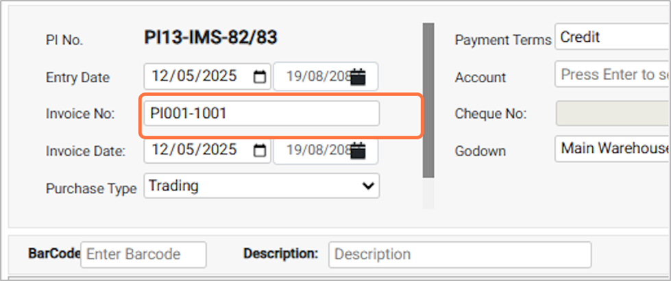5. Enter the invoice number For Eg: PI001-1001¶