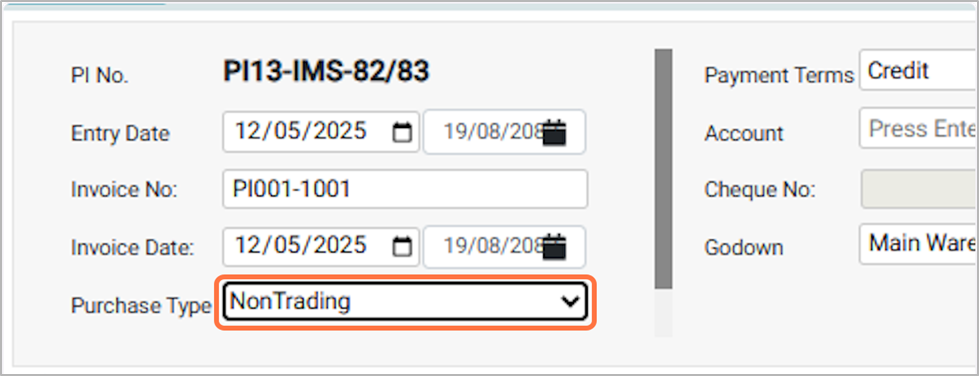 ● Non-Trading: Select this option if you are purchasing goods or services not intended for resale, such as office supplies, assets, or services used for business operations.