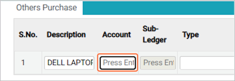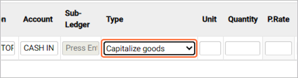 Choose the appropriate non-trading purchase type. Select Capitalize Goods for assets such as laptops or other items that are recorded as fixed assets and reused in the future. Select Non-Capitalize for one-time usable items like office stationery (pens, papers, etc.). For now, we will choose Capitalize Goods.¶
