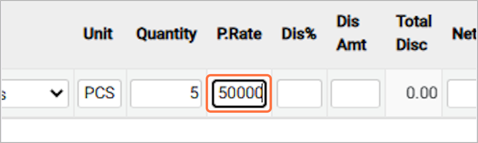 20. After entering the purchase rate and any discount, the system displays the Net Rate, which is the final price per unit after applying the discount. For Eg: 45000¶