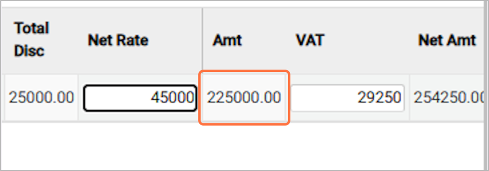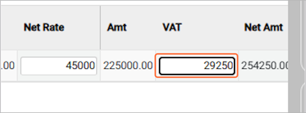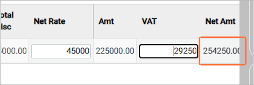 23. Shows the final payable/Net amount for the purchase, including VAT and after applying any discounts.For Eg: 254250.00¶