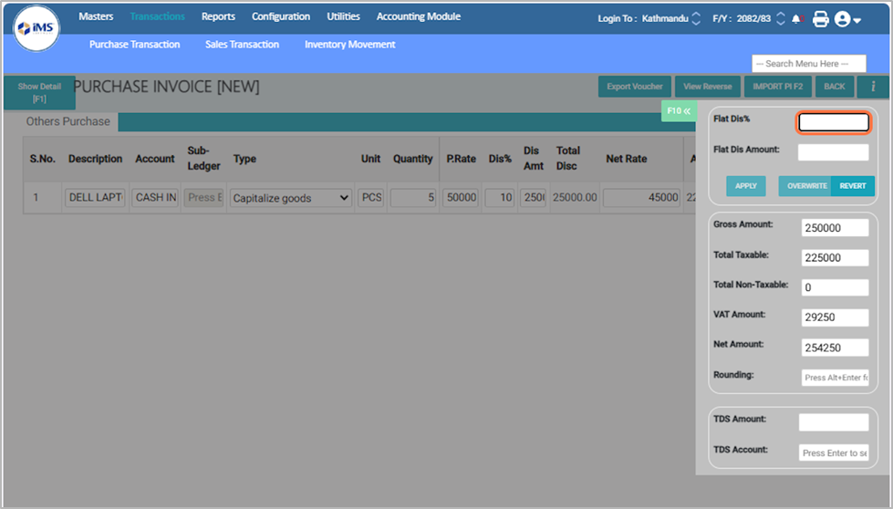 25. From this screen, you can enter a flat discount for the purchase voucher and select or change the TDS amount for that transaction.¶