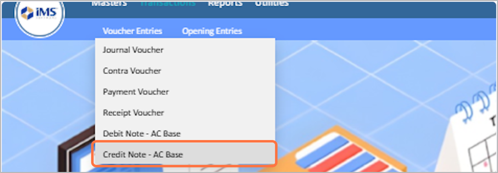 Step to Create Credit Note-AC Base: h3. 1. Click on the transactions From the main menu¶