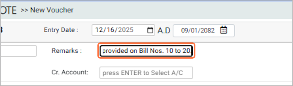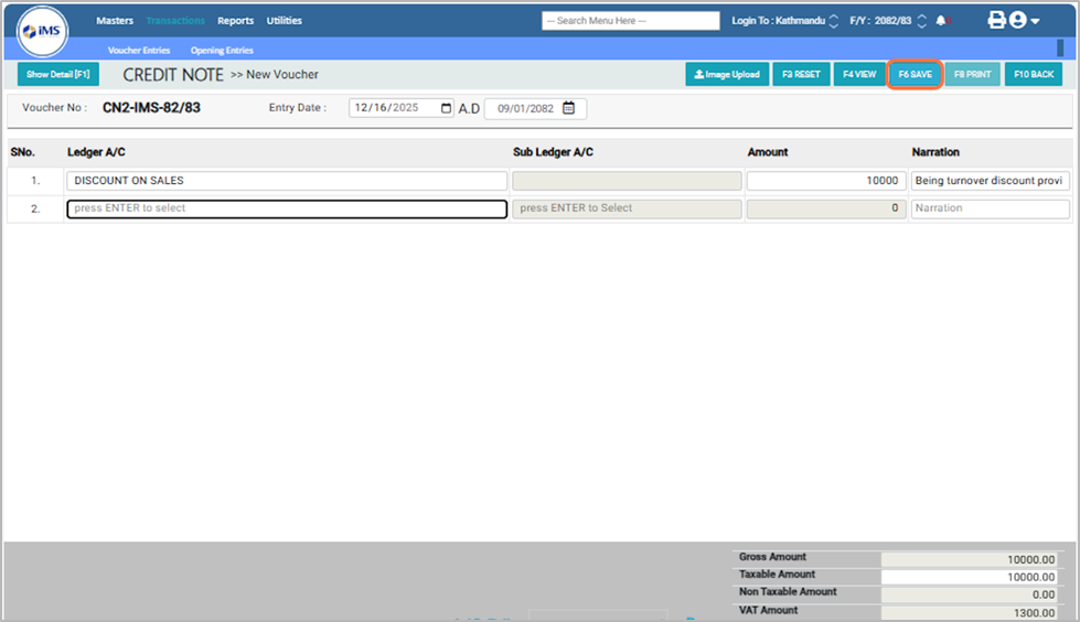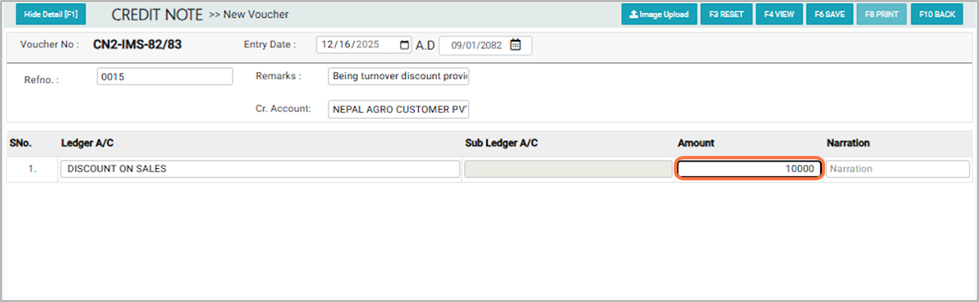 11. In the Narration field, enter a description of the transaction (e.g., Being turnover discount provided on Bill No. 10 to 20.)¶