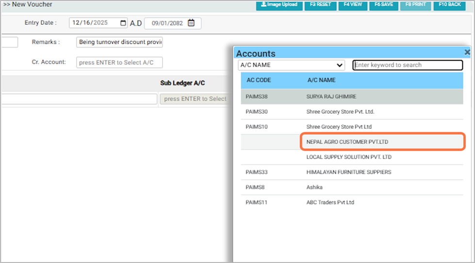 9. From the Account List pop-up, Search or choose the required ledger account, For Eg: DISCOUNT ON SALES¶