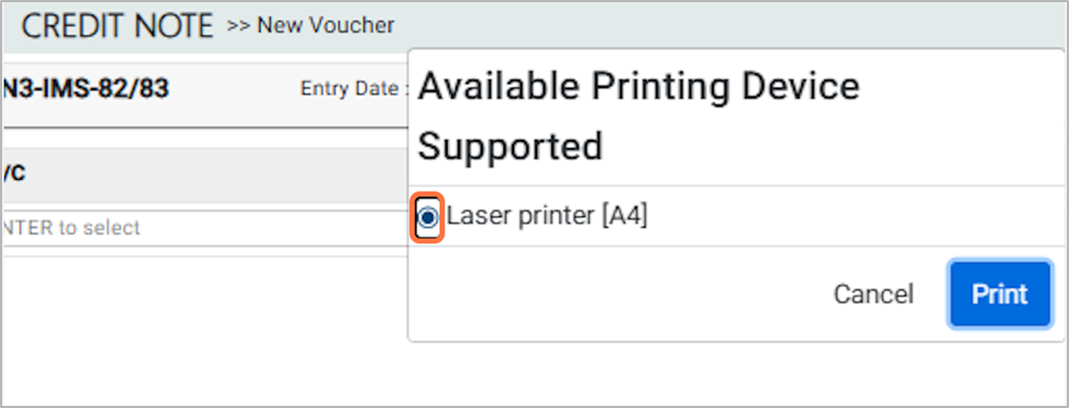15. In the Available Printing Device Supported option, select the Laser Printer [F4] and then click the Print button.¶