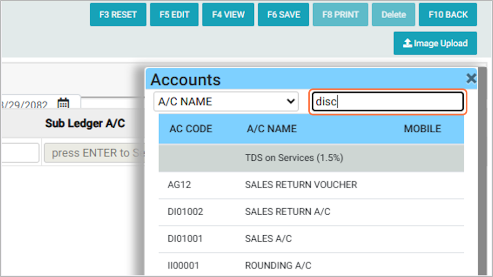 9. From the Account List pop-up, Search or choose the required ledger account, For Example DISCOUNT ON PURCHASE A/C¶