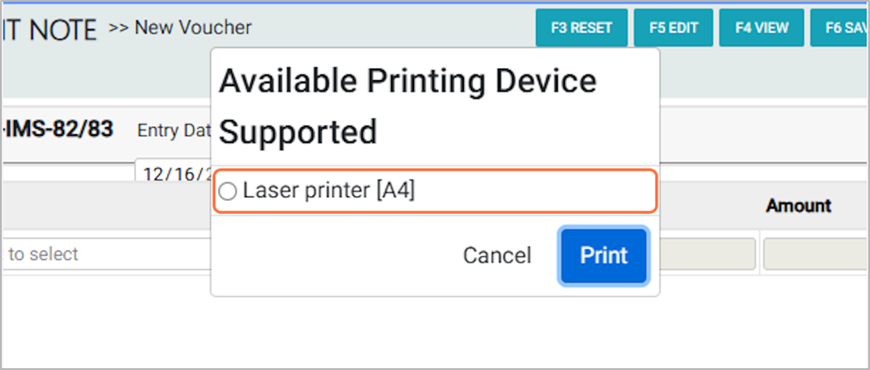 15. In the Available Printing Device Supported option, select the Laser Printer [F4] and then click the Print button.¶