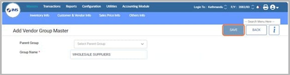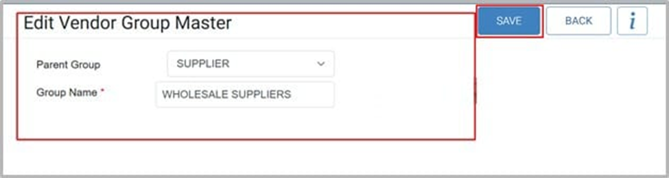 6. Select the parent group name to create a sub Vendor group under it. If no parent is selected, the system will automatically set “Vendor” as the parent group.¶