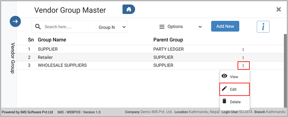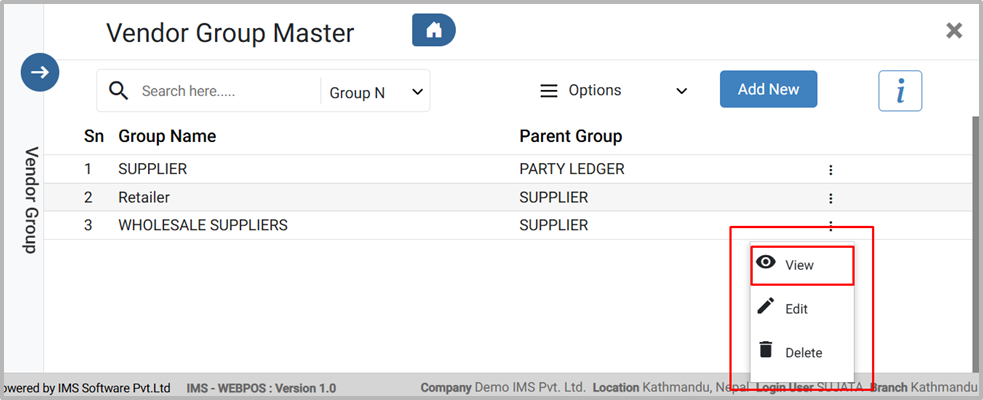 10. In the Vendor Group List, you can view, edit, or delete vendor groups. Click the View button to see vendor group details.¶