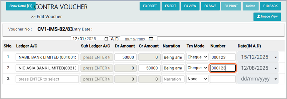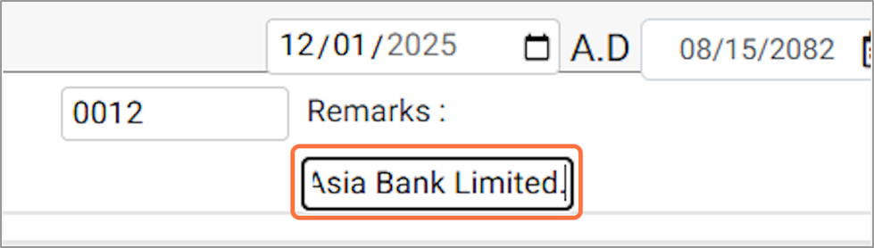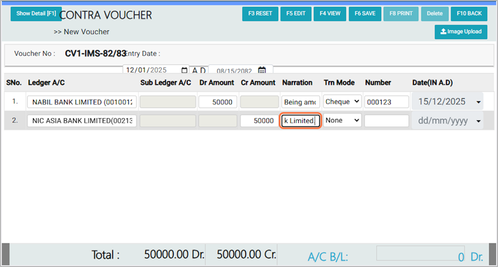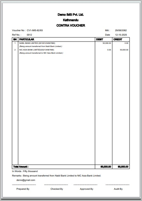 6. Enter remarks to explain the contra voucher transaction (e.g., cash deposited to bank, cash withdrawn from bank, or bank-to-bank transfer), Example: Being amount transferred from Nabil Bank Limited to NIC Asia Bank Limited.¶