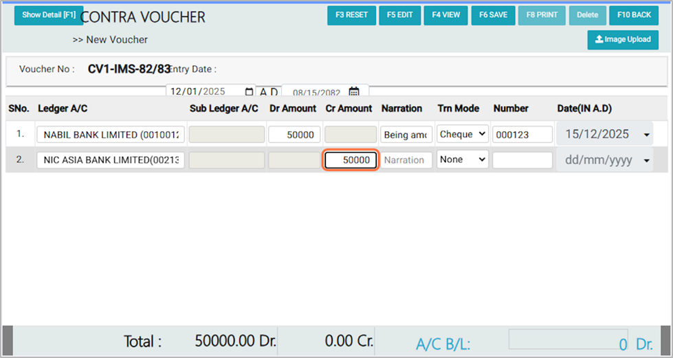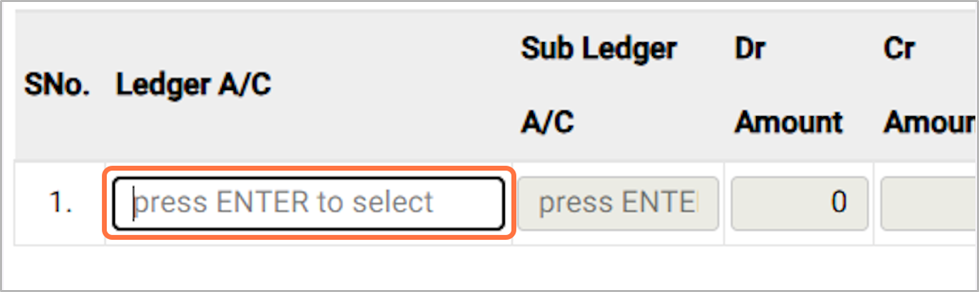 15. Enter the Credit (CR) amount for the selected ledger account. It must be equal to the Debit (DR) amount, for EG: 50000¶