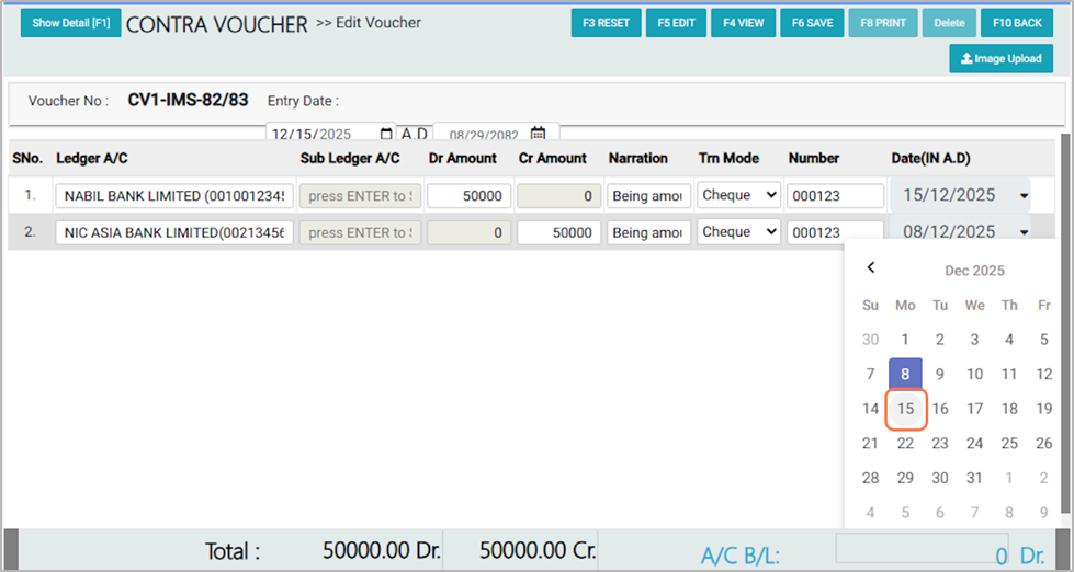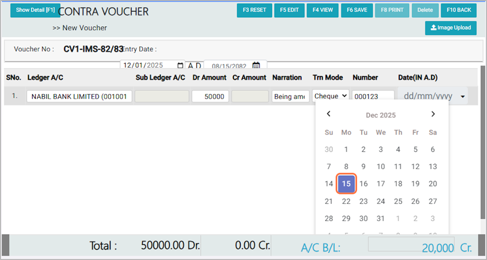 14. Click on the Ledger Account field and press Enter. From the account list, search or select the account name, For EG: NIC ASIA BANK LIMITED¶