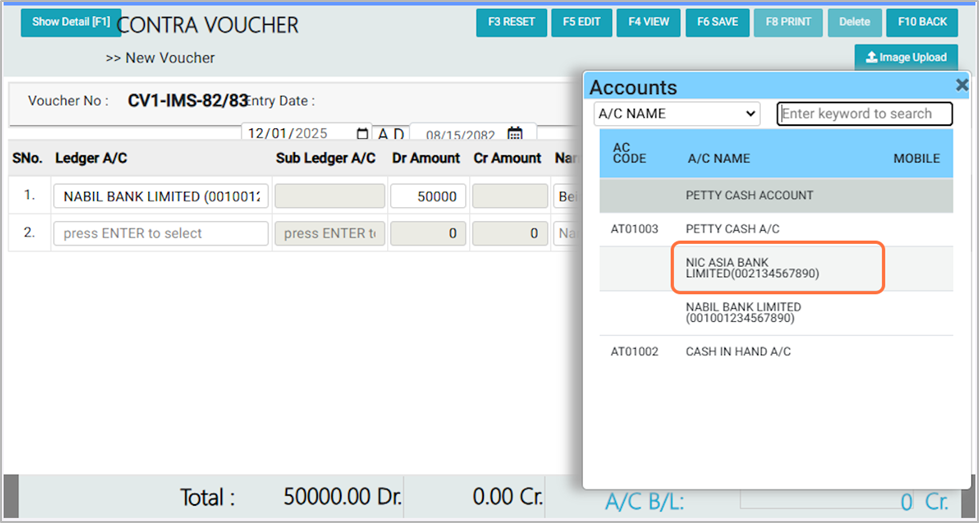 8. From the Account List pop-up, Search or choose the required ledger account, For Eg: NABIL BANK LIMITED (001001234567890)¶