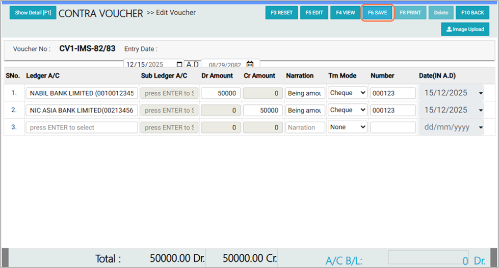 20. Click on The F6 or SAVE Button for save the Contra Voucher Entry.¶