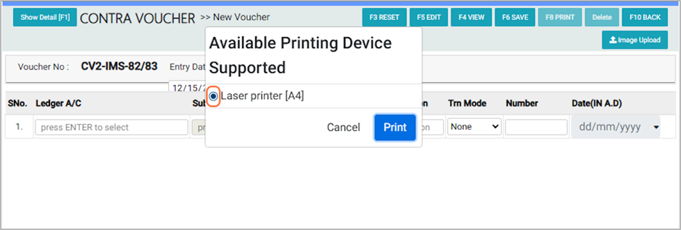 22. In the Available Printing Device Supported option, select the Laser Printer [F4] and then click the Print button.¶