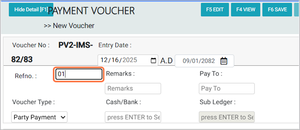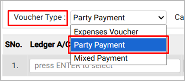 For this transaction, select Party Payment as the Voucher type.