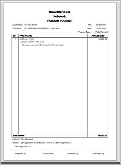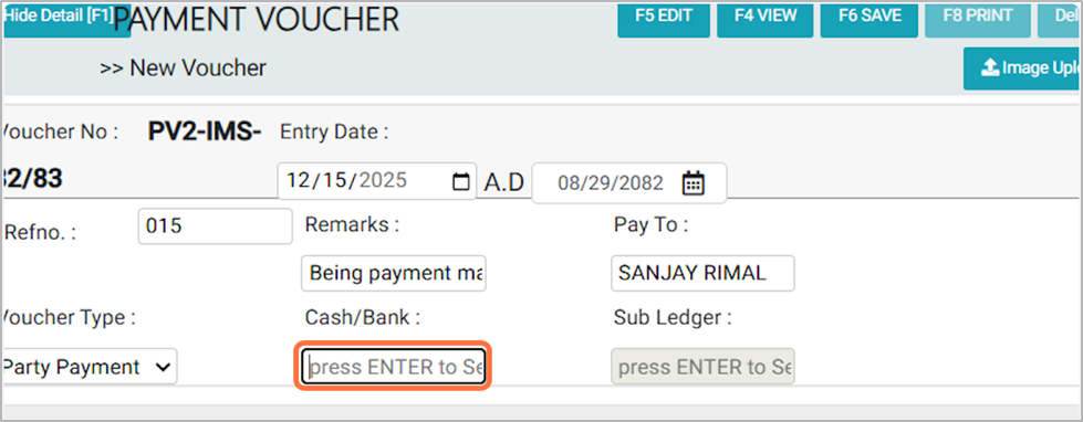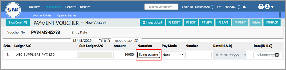 7. In the Pay To field Specify the name of the person or party to whom the payment is made, For Example:SANJAY RIMAL¶