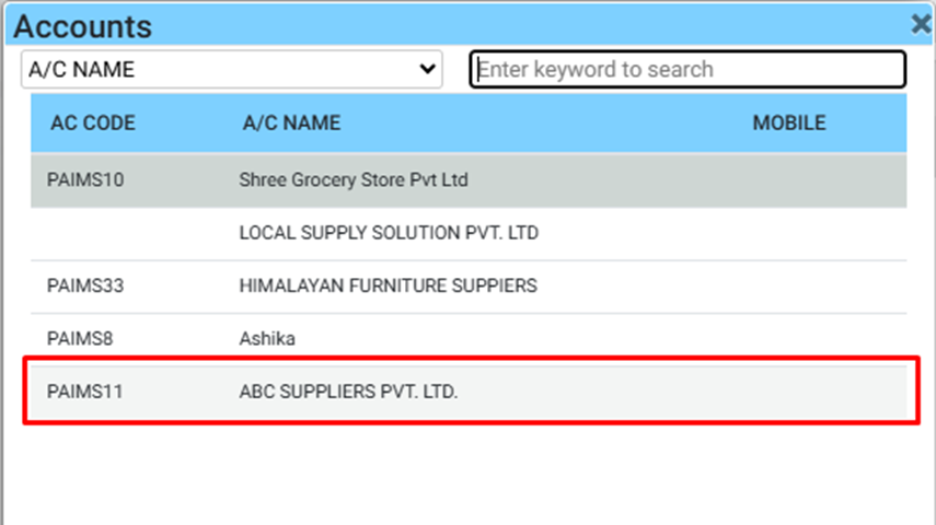 11. From the Pop Up list, search or select the appropriate ledger account for the transaction, For EG: ABC SUPPLIERS PVT. LTD.¶