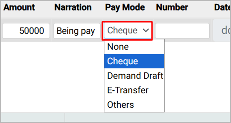 14. In the Pay Mode field, select the appropriate payment method from the available options: