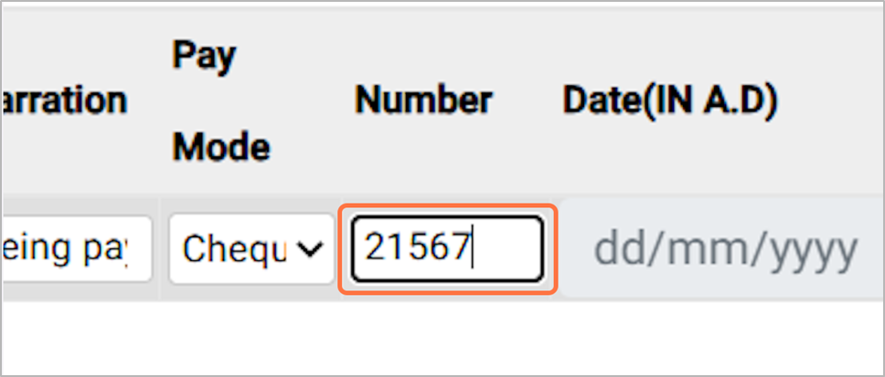 15. Enter the Cheque number, For Eg: 21567¶
