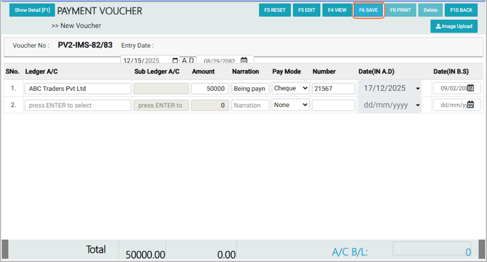 17. After entering all required details, click the Save button to record the voucher¶