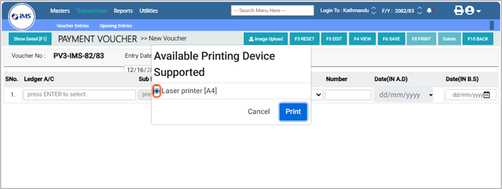 20. In the Available Printing Device Supported option, Choose the option as your need and then click the Print button, For EG: Laser Printer [A4]¶