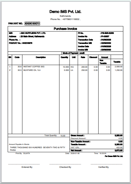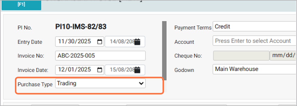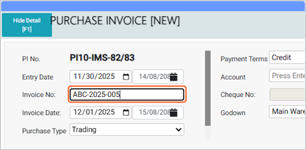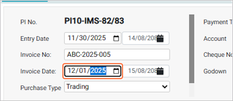 - The Purchase Entry Date is the date of the purchase invoice entry, which can be edited as needed; backdating is allowed but future dates are not. Eg: 2025-11-30.