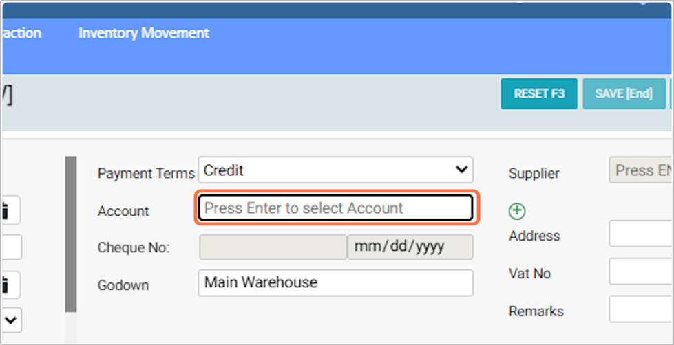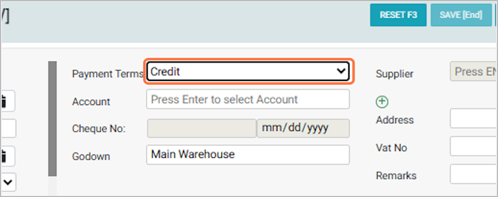 If you select Credit, Cheque, or Other as the “payment terms”, enter the “Account” as supplier, and the “Supplier details” will be auto-filled.