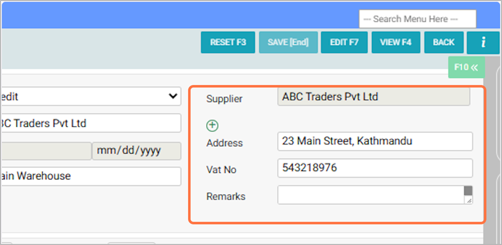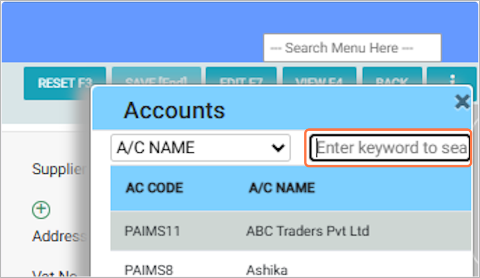 10. Select or search the supplier/vendor account as mentioned in the purchase invoice, e.g., ABC Traders Pvt Ltd.¶