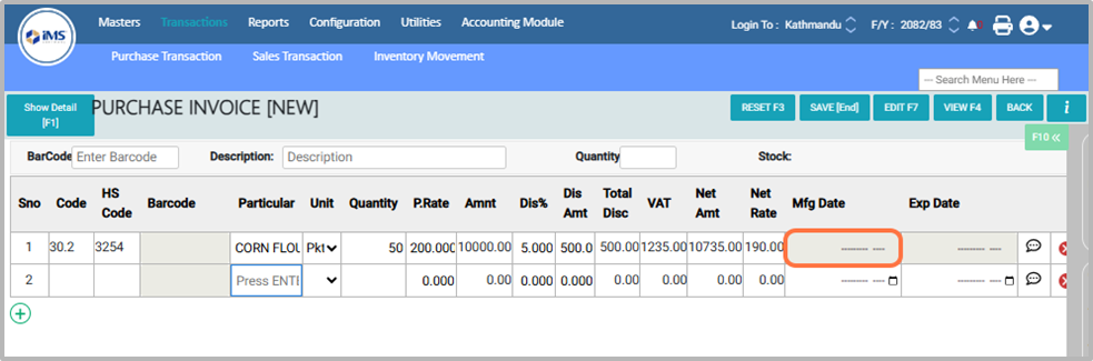 - Save: Saves the purchase entry in the system.