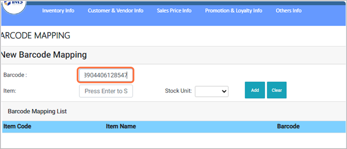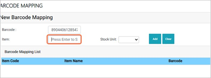 7. Click "Add" to add the item to the grid; to map multiple barcodes, repeat the process, or click "Clear" to remove any existing mappings before adding.¶