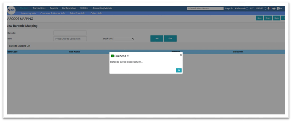 9. After clicking the Save button, a pop-up message saying "Barcode Saved Successfully" will appear. Click OK to complete the process.¶