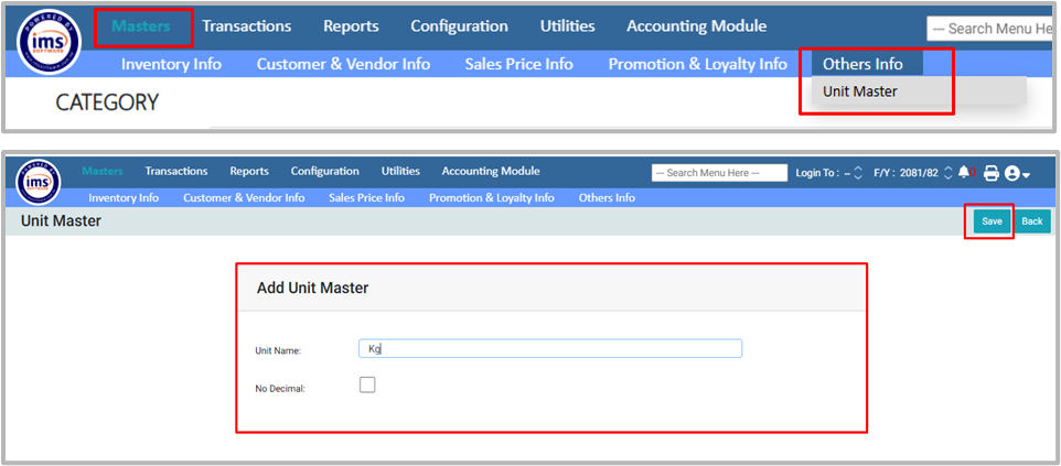 - Enter the Unit Name (e.g., pcs, kg, liter)
